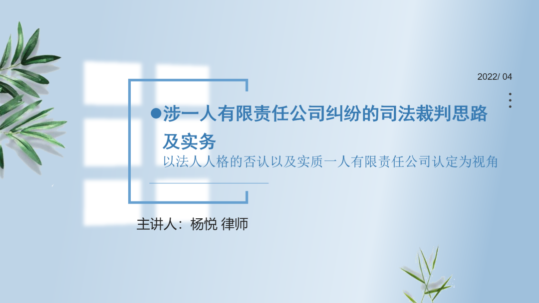 2022年4月29日,在疫情期间,这次的主讲人杨悦律师克服困难开展了讲座活动。本次讲座主题为“涉一人公司纠纷诉讼实务”。